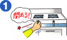 器具栓を閉めるか、運転スイッチを切り、全てのガス機器を止めて下さい。屋外のガス機器も忘れずに!使っていないガス栓は閉まっていることを確認してください。